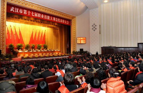 元月15日下午,武汉剧院锣鼓喧天,凯歌飞扬。荣获武汉市第十七届职业技能大赛的全体技术状元、技术能手、优秀组织单位和个人与全市职工代表、相关单位负责人欢聚一堂,满怀喜悦的心情参加市大赛领导小组举行的“武汉市第十七届职业技能大赛总结表彰大会”。市委常委、市总工会主席朱毅,市人大副主任胡绪鹍,市人民政府副市长秦军,市政协副主席李传德出席会议并为获奖单位和个人颁奖。